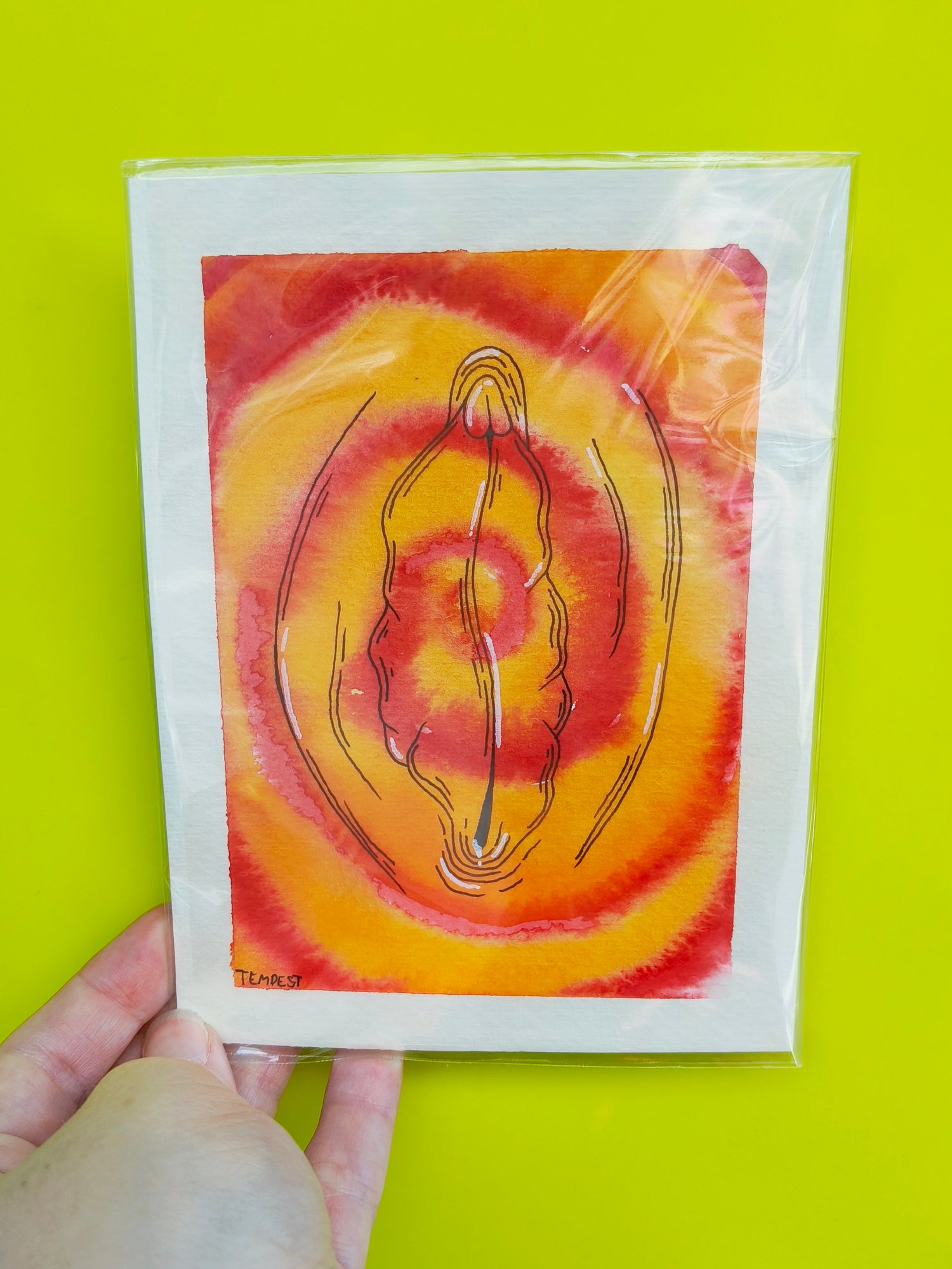 No two vulvas are alike just like these paintings. All are hand drawn with hand done water colour backgrounds.